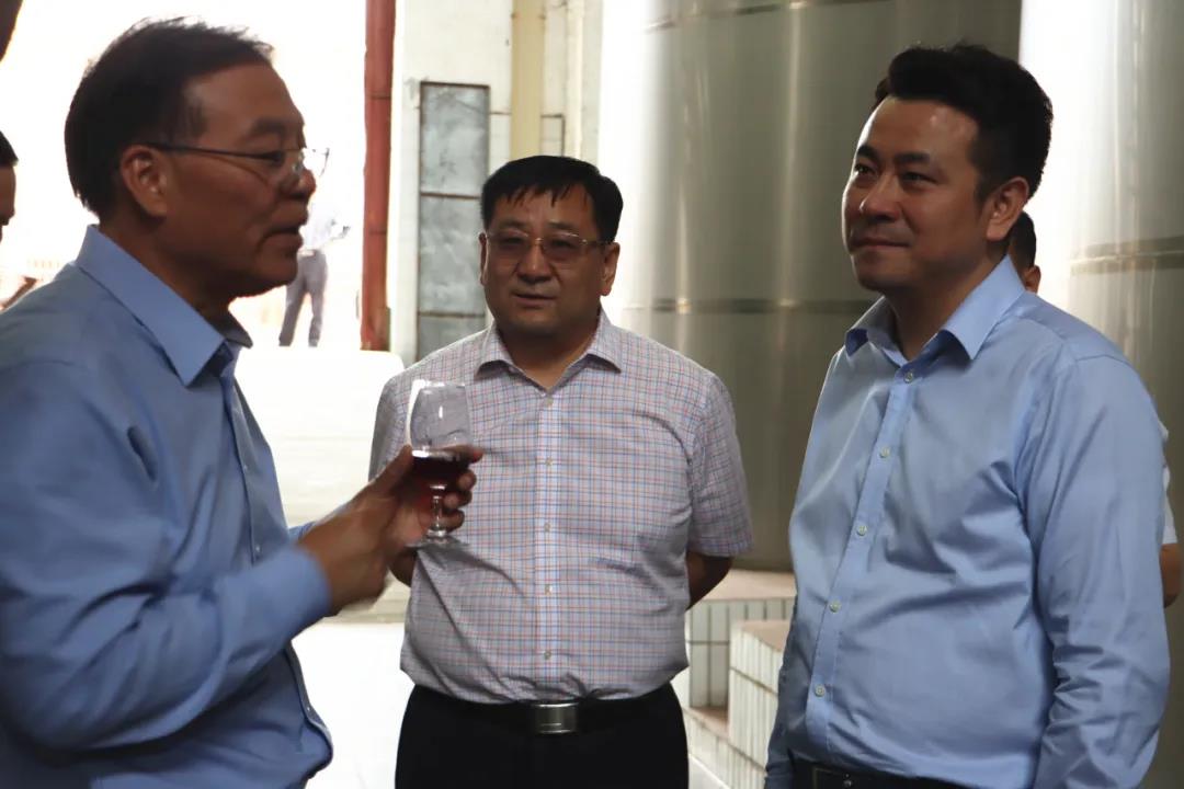 調(diào)研組一行在葡萄酒貯藏車(chē)間品嘗葡萄原酒