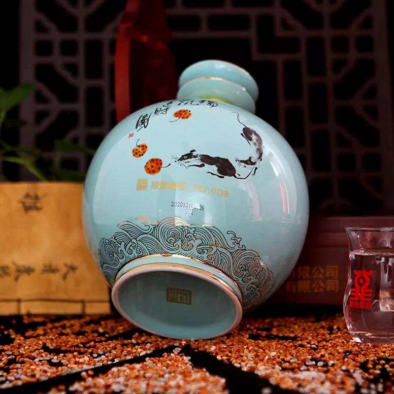 皇臺(tái)·鼠年生肖酒,瓶身為帝王壇瓶型?;宜{(lán)色系,寧靜高遠(yuǎn)。細(xì)膩圓潤的瓶身上,燙金字體,襯得瓶身愈發(fā)高端典雅;兩只小老鼠,拙樸可愛,姿態(tài)不一,意趣盎然?;逝_(tái)·鼠年生肖酒,巧秒地將生肖文化和酒文化完美地融合在了一起,在高端閑適之間,讓人感受到一絲輕松、愉悅和寧靜的氣息。真可謂壺中日月,酒中春秋!
