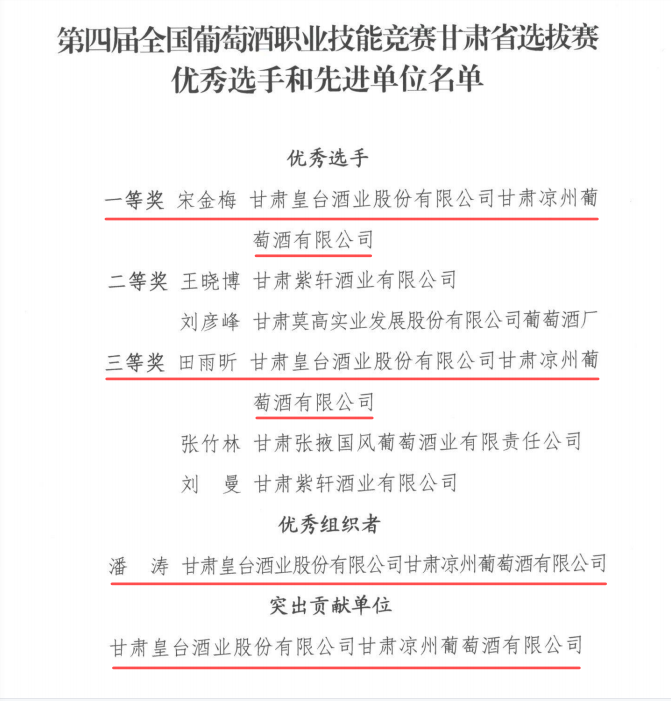 近日,甘肅省釀酒工業(yè)協(xié)會(huì)和甘肅省經(jīng)貿(mào)工會(huì)工作委員會(huì)聯(lián)合下發(fā)了《關(guān)于第四屆全國葡萄酒職業(yè)技能競(jìng)賽甘肅省選拔賽優(yōu)秀選手和先進(jìn)單位的通報(bào)》,對(duì)在全國決賽和甘肅省選拔賽中成績(jī)優(yōu)異選手、優(yōu)秀組織者以及為技能競(jìng)賽作出突出貢獻(xiàn)的甘肅皇臺(tái)酒業(yè)股份有限公司甘肅涼州葡萄酒有限公司予以通報(bào)表彰。