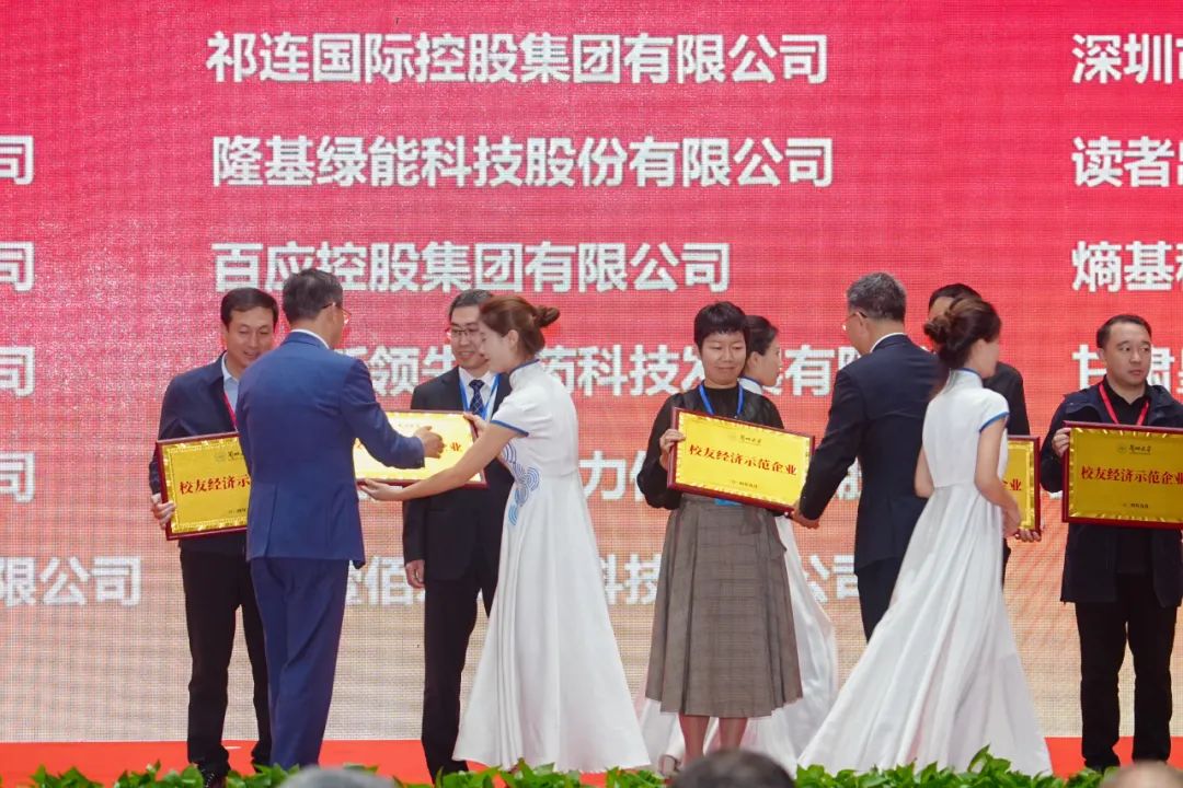 在隨后的大會(huì)現(xiàn)場(chǎng)頒獎(jiǎng)及授牌儀式中,嚴(yán)純?nèi)A向?qū)μm州大學(xué)教育事業(yè)作出顯著貢獻(xiàn)的個(gè)人及企業(yè)代表頒發(fā)了獎(jiǎng)項(xiàng)。甘肅皇臺(tái)酒業(yè)股份有限公司榮獲“校友經(jīng)濟(jì)示范企業(yè)”榮譽(yù)獎(jiǎng)牌,總經(jīng)理代繼陳代表公司上臺(tái)領(lǐng)獎(jiǎng)。