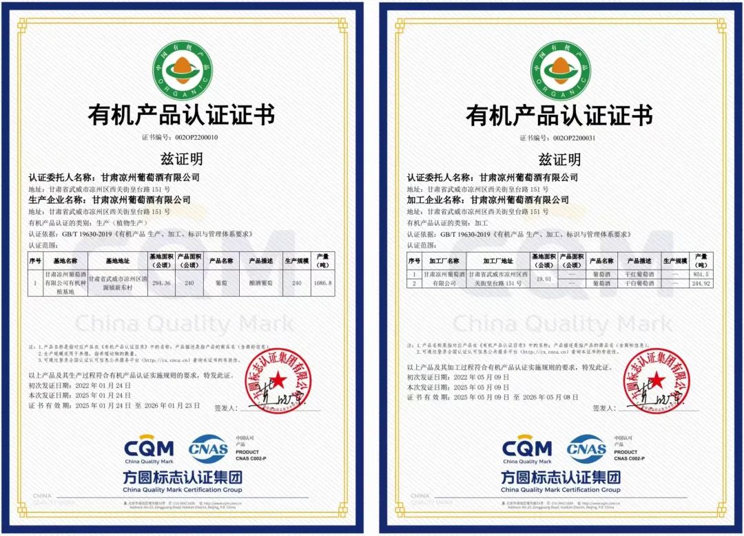 2024年11月,甘肅皇臺酒業(yè)股份有限公司旗下的甘肅涼州葡萄酒有限公司及其葡萄種植基地,經(jīng)過權威認證中心的嚴格審查和評估,雙雙通過了有機產(chǎn)品認證。此雙證書的獲得,證明了甘肅涼州葡萄酒有限公司及其種植基地在有機種植和葡萄酒生產(chǎn)方面的突出表現(xiàn),更標志著皇臺酒業(yè)在這一領域達到了國際有機產(chǎn)品標準的高度。