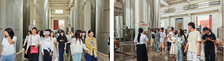 隨后,師生們滿懷期待地踏入葡萄壓榨車間與儲酒車間,進行一場葡香馥郁間的匠心探尋。一套套現(xiàn)代化設(shè)備旁,學(xué)生們了解了葡萄果實如何從田間到生產(chǎn)線、如何發(fā)酵轉(zhuǎn)變成酒液,通過對干紅和干白葡萄酒的品鑒,將釀造匠心與工藝傳承悄然銘刻心間。